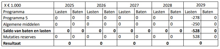 - Daarom de investering van € 12.500.000 (afschrijvingstermijn 60 jaar, annuïtair) in 2029 te schrappen en daarmee structureel vanaf jaar 2029 de kapitaallasten op programma 5 met