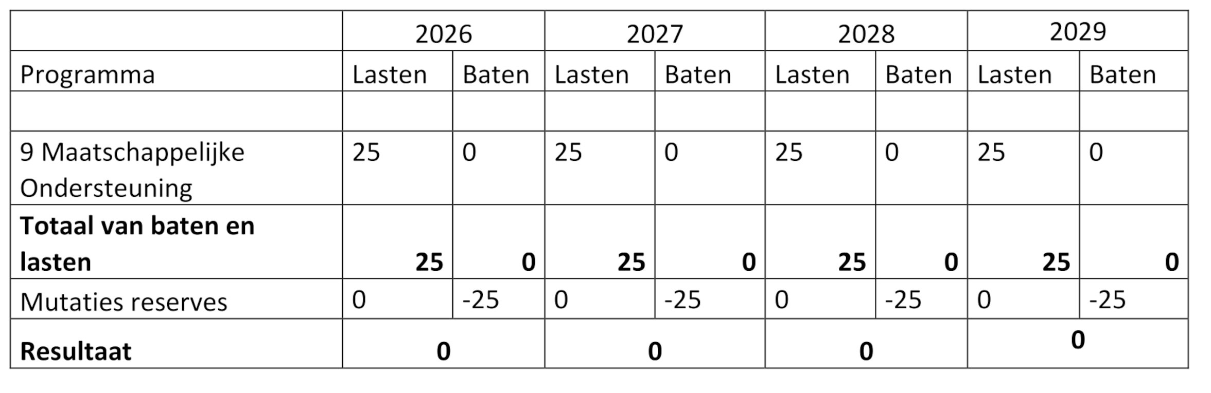 - Daarom het budget van programma 9 Maatschappelijke Ondersteuning vanaf 2026 structureel te verhogen met € 25.000;