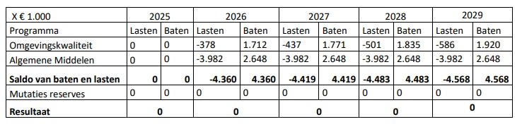 - Daarom structureel de lasten op programma 11 Algemene Middelen met € 3.982.000 te verlagen en de lasten op programma 5 Omgevingskwaliteit met € 378.000 in 2026; € 438.000 in 2027; € 502.000 in 2028 en € 586.000 in 2029 te verlagen.